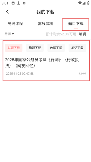 4、进入我的下载页后,切换到【题目下载】标签,就能看到刚下载好的真题试卷啦。