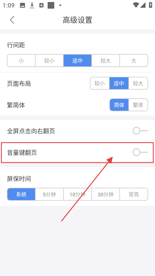4、在高级设置界面可开启【音量键翻页】功能,让翻页更便捷,提升阅读体验啦。