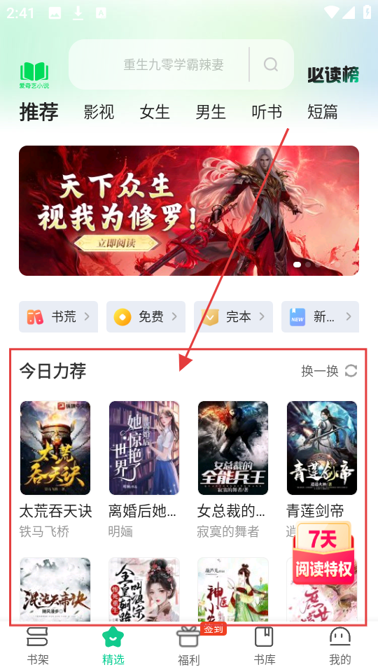 1、打开软件,在精选页面的【今日力荐】里,有好多精彩小说,快选一本感兴趣的,开启阅读之旅吧。
