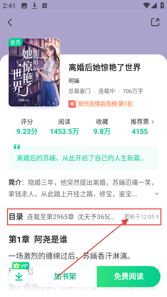2、进入小说详情页,能看到评分、阅读量等信息,想选章节看的话,点击【目录】就好啦。