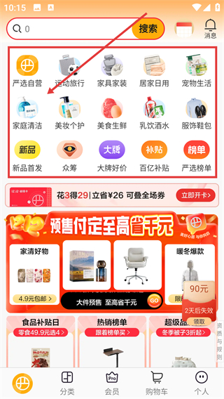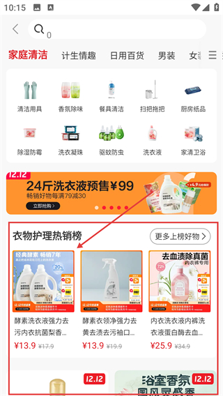 1、进入购物应用主界面后,点击【家庭清洁】分类,就能进入对应品类的商品列表页挑选好物啦。