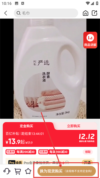 3、进入商品详情页后,若该规格不支持定金购,点击【换为现货购买】就能切换购买方式啦。