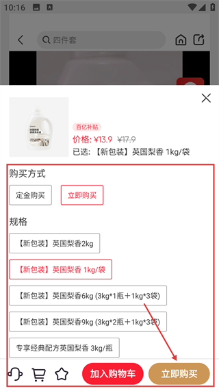 4、在商品规格选择页,选好购买方式和规格后,点击【立即购买】就能进入结算环节啦。