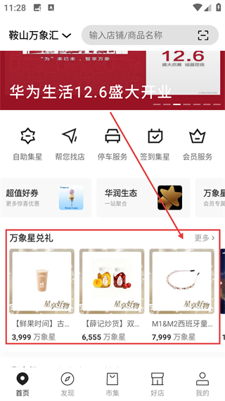 1、在鞍山万象汇的首页,找到【万象星兑礼】板块,点击更多可进入兑礼页面,查看可兑换的礼品啦。