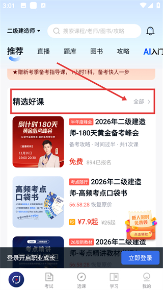 1、在二级建造师备考应用首页,点【精选好课】旁的“全部”按钮,能进入全部课程列表页选适合的课哦。
