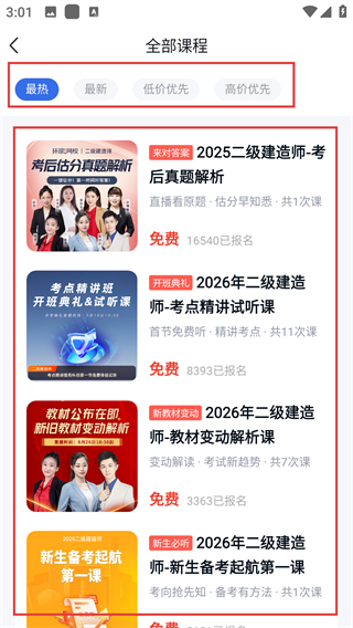 2、进入全部课程页后,可按【最热】【最新】等排序方式筛选课程,找到心仪的备考课开始学习啦。