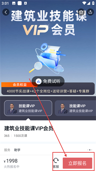 3、进入建筑业技能课VIP会员页后,点【立即报名】按钮,就能进入报名流程解锁会员课程权益啦。
