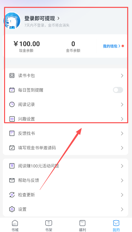 3、阅读有福利,记得每天来福利页签个到,奖金能累积,读一本书还能参与百元提现活动。