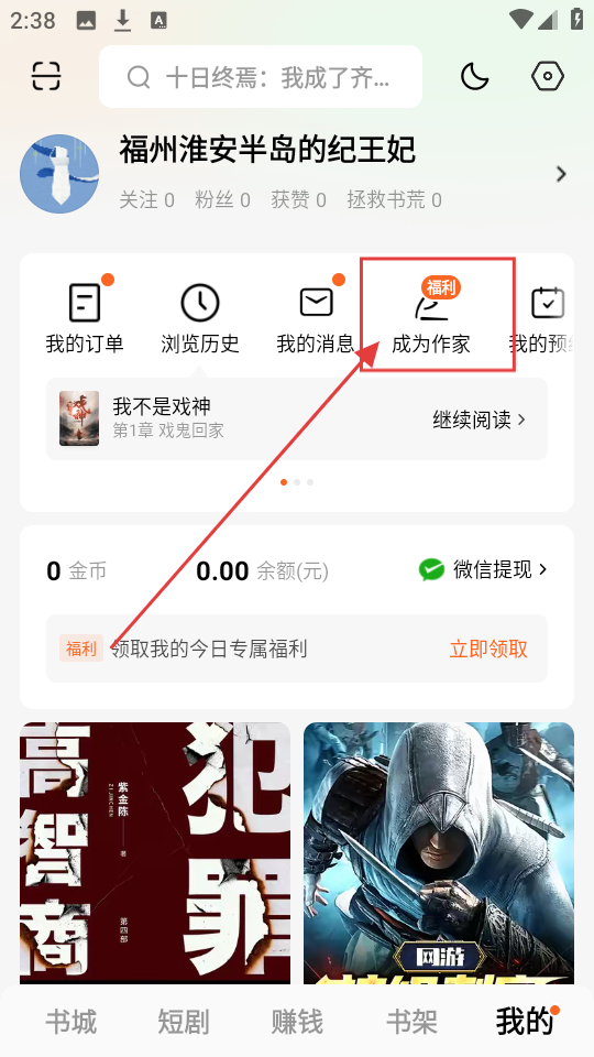 1、在【我的】页面,点击【成为作家】选项,就能进入作家入驻相关界面,开启创作之路啦。