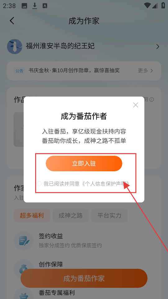 2、进入后,勾选【我已阅读并同意《个人信息保护声明》】,再点击【立即入驻】,就能申请成为番茄作者咯。