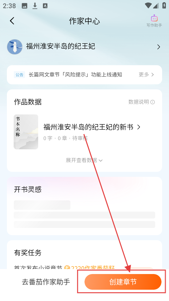 3、入驻成功后,在作家中心页面,点击【创建章节】按钮,就能开始创作章节,超棒呢。