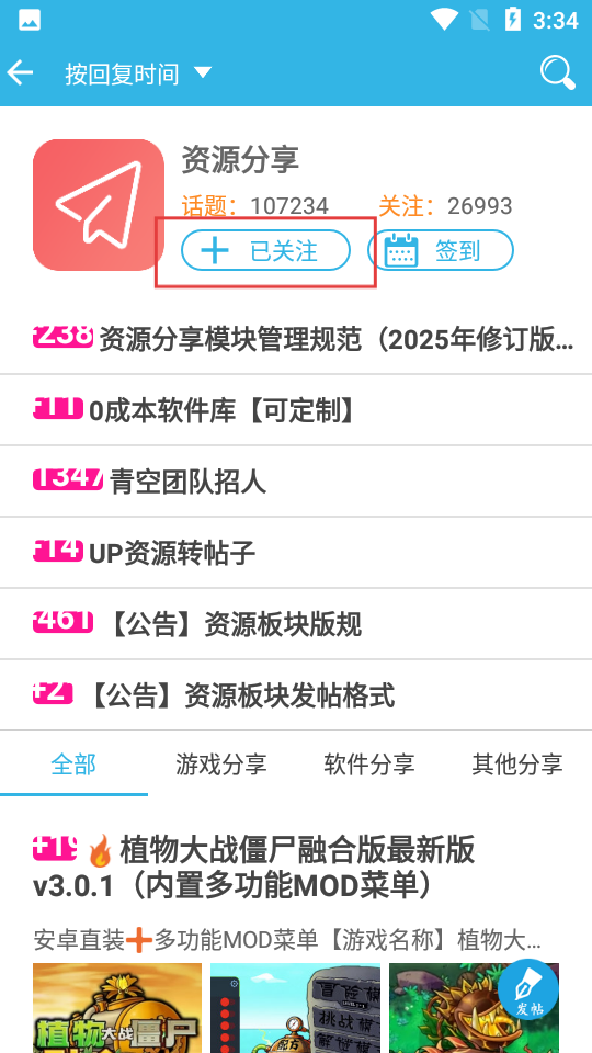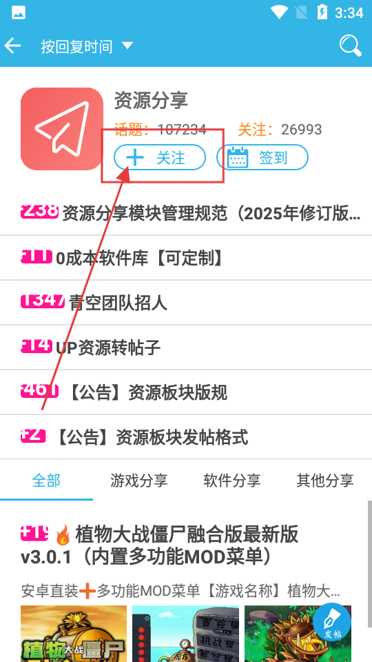 3、进入资源分享版块后,点击【关注】按钮,可关注该版块啦。