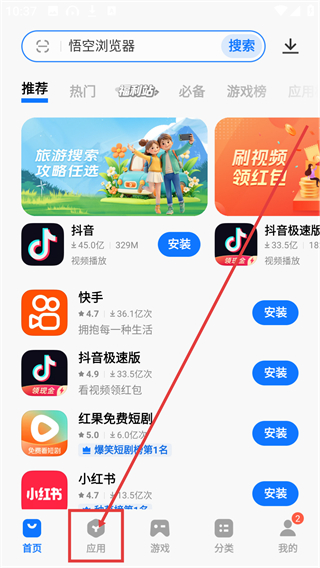 1、在首页点击底部的【应用】选项,就能进入应用专区页面,浏览各类应用的推荐内容啦。