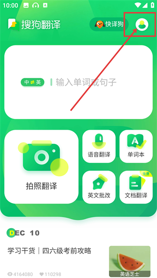 1、在【搜狗翻译】首页点击右上角的个人中心按钮,就能进入个人相关功能页面啦。