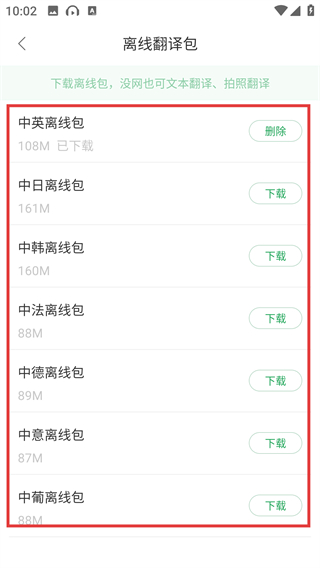3、在离线翻译包页面选择想要的包,比如【中英离线包】,点击对应的【下载】按钮就能开始下载啦。