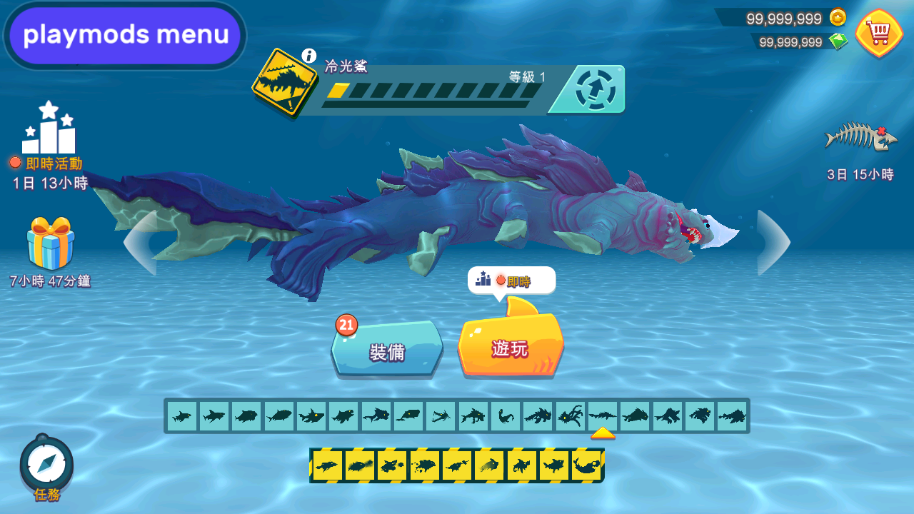 2、饥饿鲨:进化国际服游戏的解锁更多水下野生动物:Makohai、锤头鲨、虎鲨、无敌大白鲨