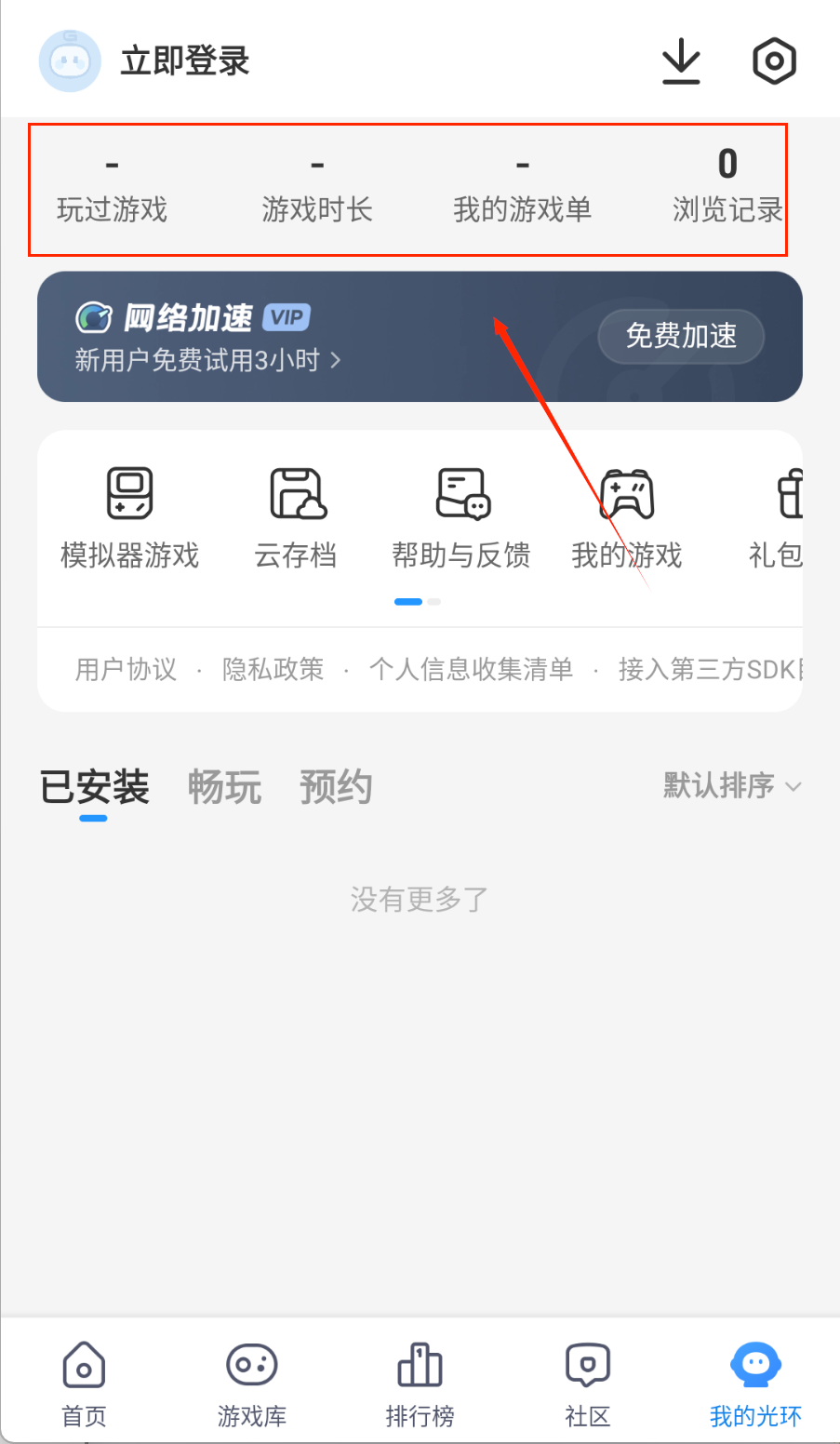 1、打开软件后首先完成账号登录,点击右上角"立即登录"按钮,注册或登录后可以解锁更多功能,比如查看个人游戏记录和收藏列表。