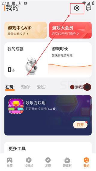 2、在个人中心页点击右上角【设置】图标,可进入设置界面,调整游戏中心的功能配置哦。