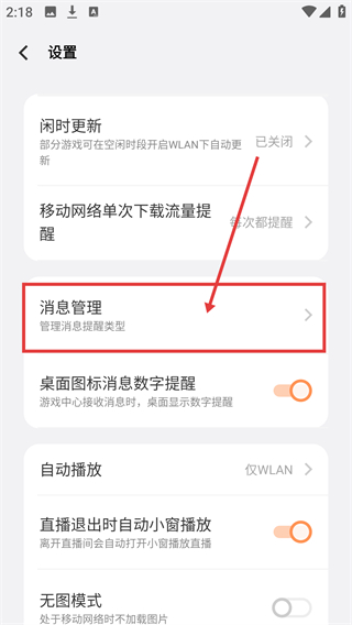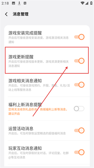 4、在消息管理页可开启或关闭【游戏更新提醒】,按需设置能及时收到游戏更新的消息通知哦。