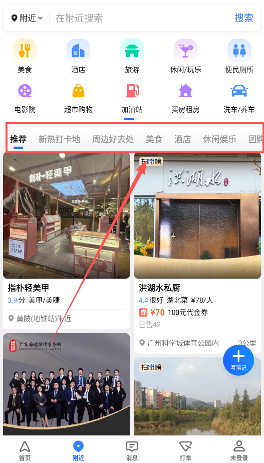 2、想找附近吃的玩的,就点开下面的附近页签,美食酒店加油站等都分门别类,直接点进去看列表和距离,非常省心。