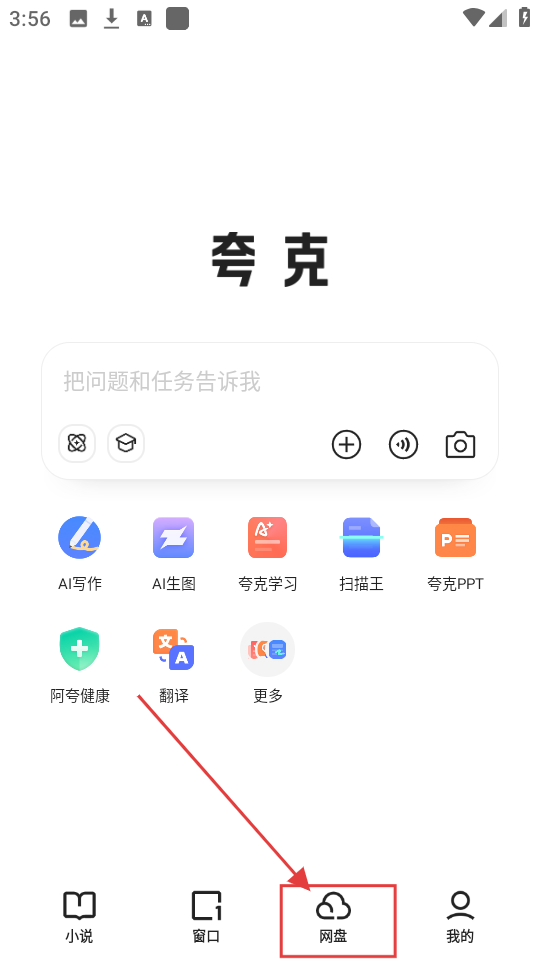 1、夸克首页超丰富,AI写作、翻译这些功能都有!要是想管理文件,点底部【网盘】,瞬间就能进到网盘页面啦。