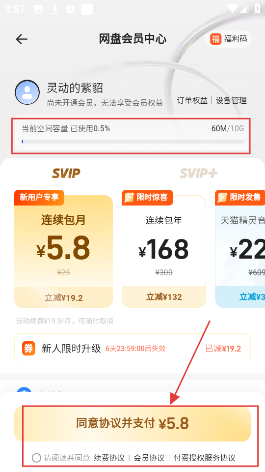 4、进到网盘会员中心,SVIP连续包月这些套餐任你选,选好之后,点【同意协议并支付¥5.8】,分分钟就能开通啦。