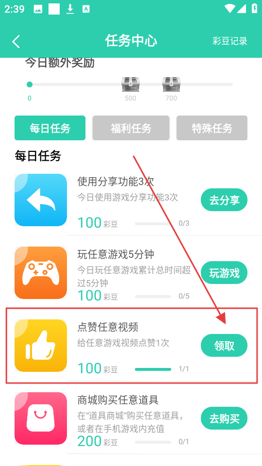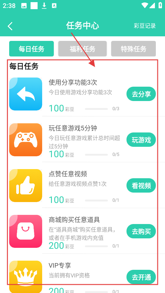 3、在任务中心的每日任务里,有【使用分享功能3次】【玩任意游戏5分钟】等任务,完成就能获得彩豆啦。