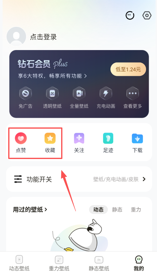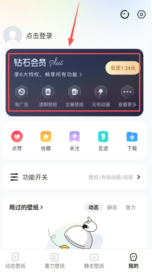 3、刚打开软件时会提示登录,登录后能看到“钻石会员Plus”的推广,介绍了一些特权比如免广告和使用全量壁纸。