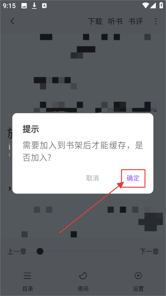 2、弹出提示框后,点击【确定】按钮,将小说加入书架,以便进行缓存操作哦。
