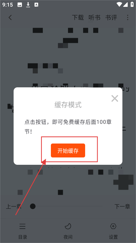 3、在缓存模式弹窗中,点击【开始缓存】按钮,即可开始免费缓存后面100章节呢。