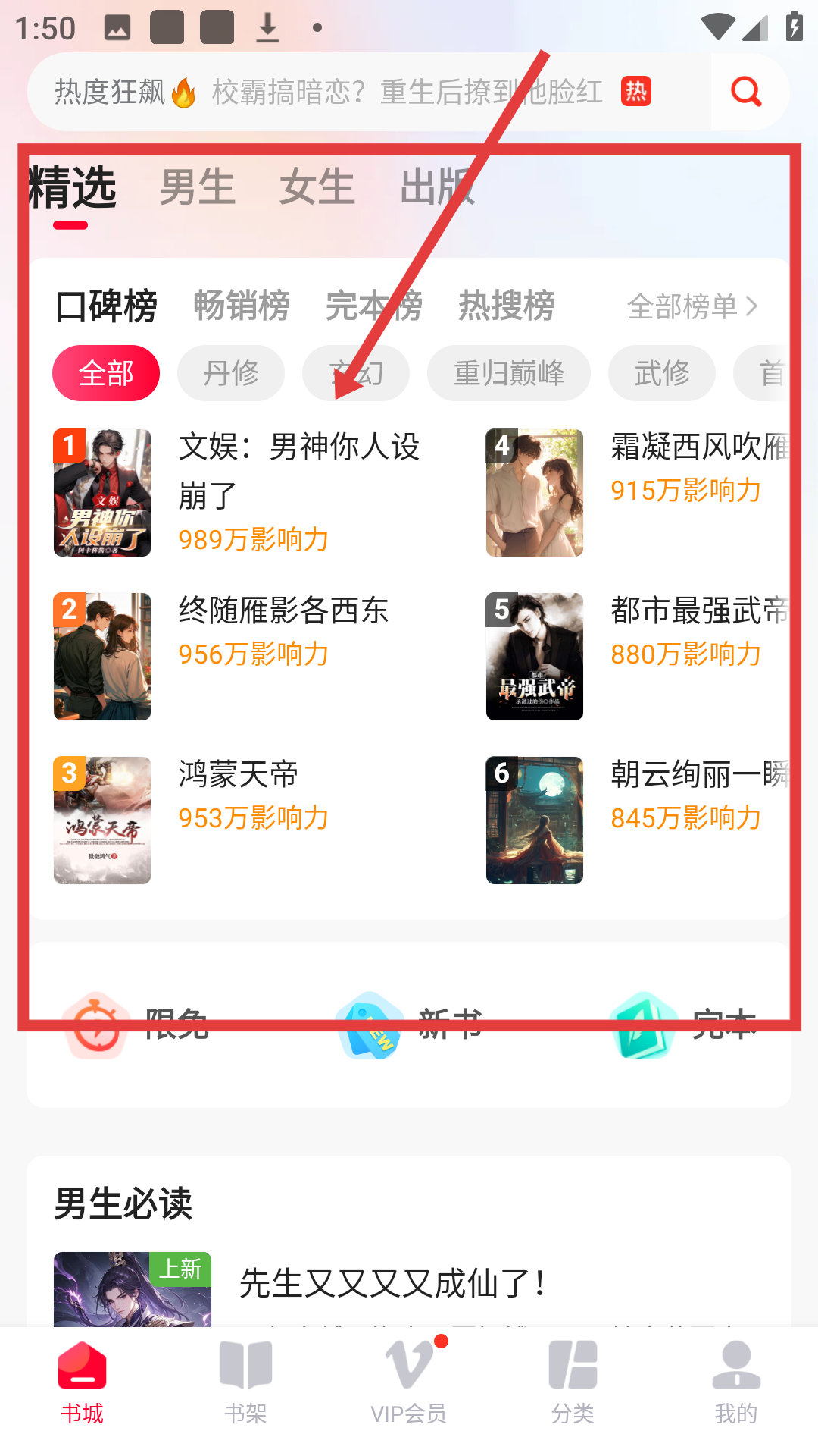 1、在书城页面,可浏览精选榜单的小说,如《文娱:男神你人设崩了》,点击可进入小说详情页啦。