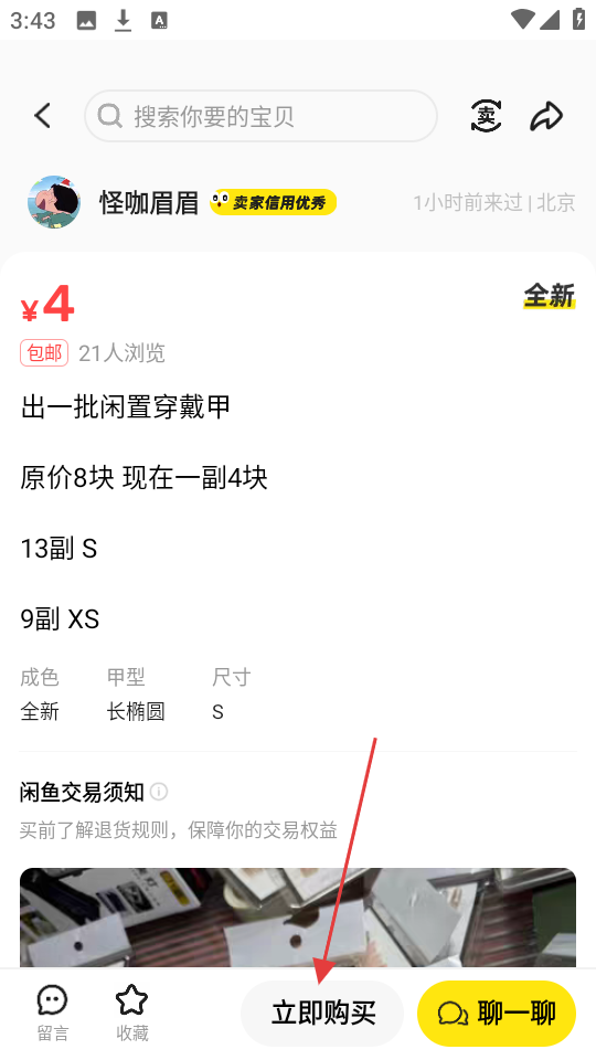 3、进入商品详情页,若确定要买,就点击底部【立即购买】按钮,开启购买流程。