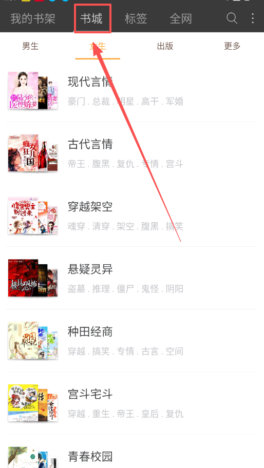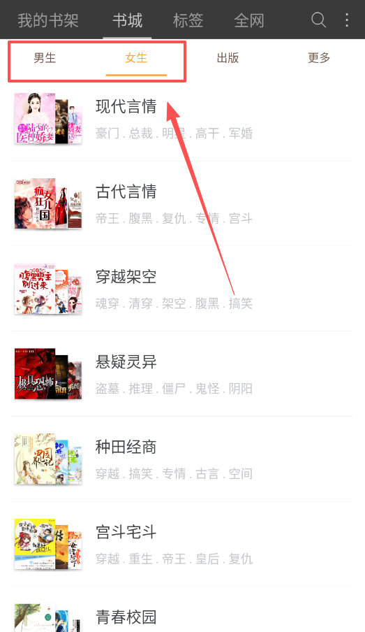 2、想系统浏览,可使用书城内的“男生”或“女生”分类导航,它采用“大类+细分标签”的结构。