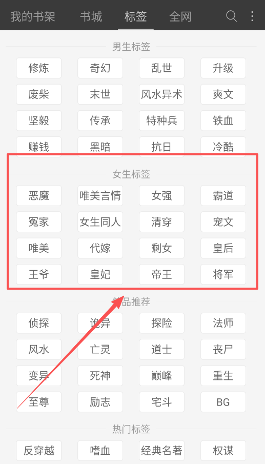 3、追求精准匹配时,“标签”页面是你的利器,它将海量题材浓缩为“修炼”、“女强”、“侦探”、“权谋”等关键词。