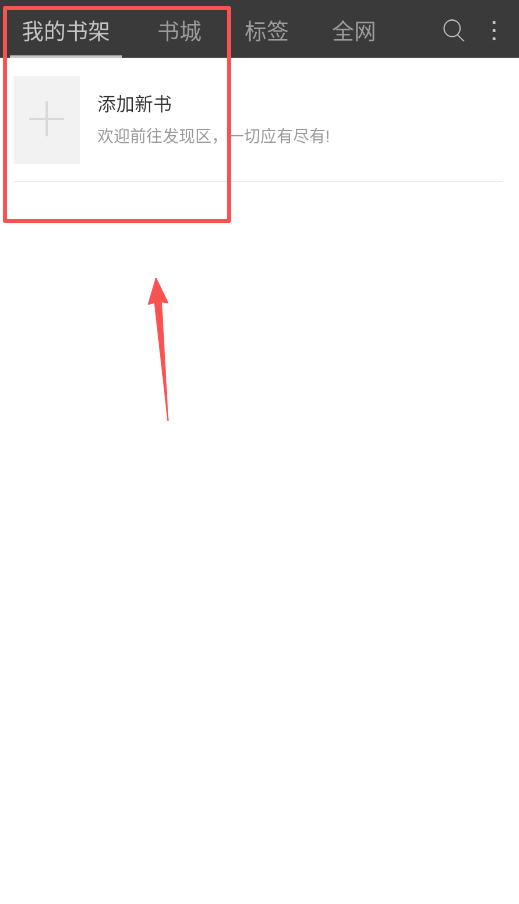 4、当软件提示“添加新书”时,意味着你的发现之旅正式开启,跟随指引前往书城的发现区,你就能不断发掘并收藏合胃口的小说了。