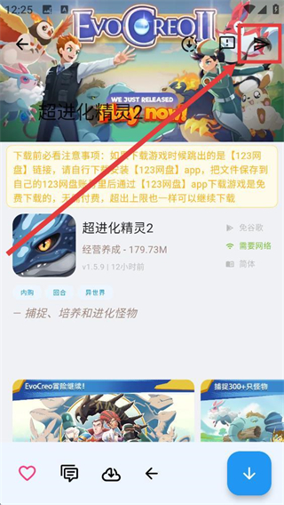 2、进入游戏详情页后,点右上角的分享按钮,就能触发分享功能,准备把游戏链接分享出去哦。
