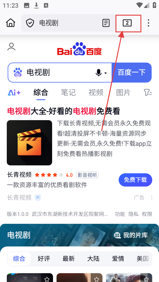 3、新建标签页后,在搜索栏输入新的内容,比如【电视剧】,进行搜索,标签页数量会增加哦。
