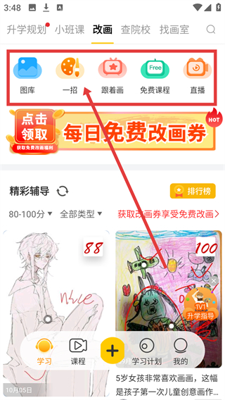 4、切换到课程页,点【跟着画】选项,能进入对应的练习课程页面,跟着教程实操绘画哦。