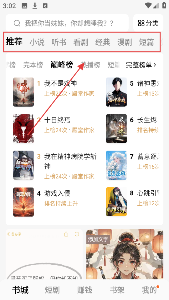 1、在书城页面,能看到【推荐】【小说】等多个分类标签,点击不同标签,可切换查看对应类型内容,超方便呢。