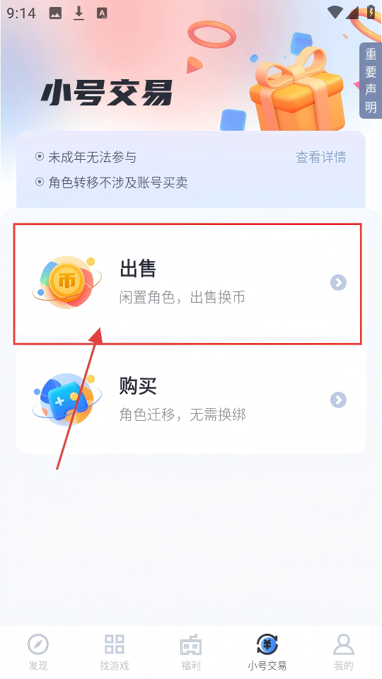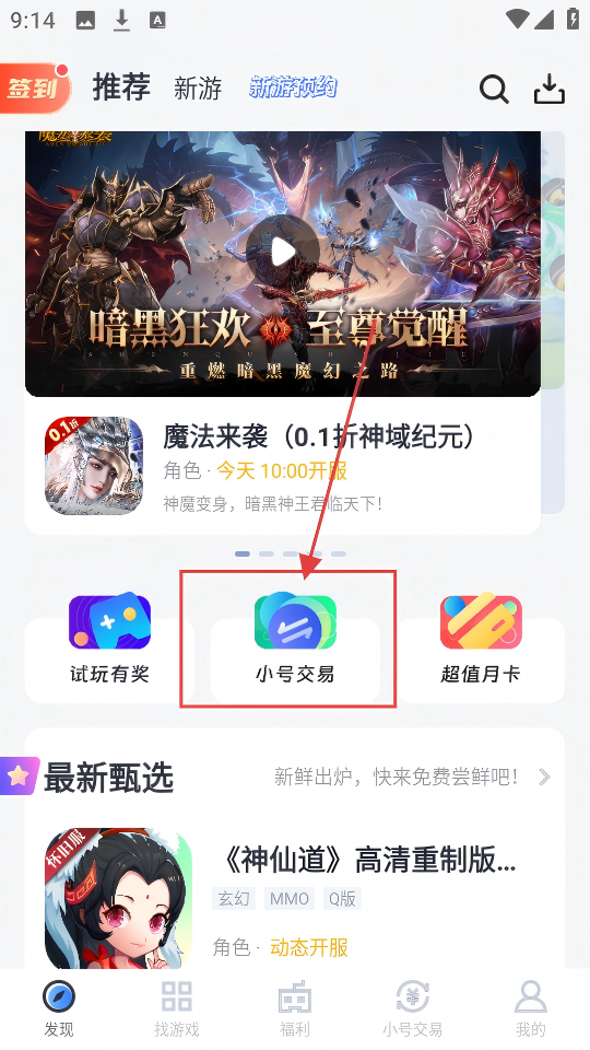 1、推荐页点【小号交易】,进入小号交易页面,可进行小号出售或购买哦。