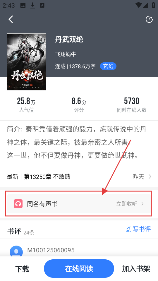 2、在书籍详情页点击【同名有声书立即收听】,就能进入有声书收听界面啦。