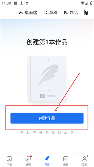 1、在写作页面,点击【创建作品】按钮,就能进入新建作品的配置流程啦。
