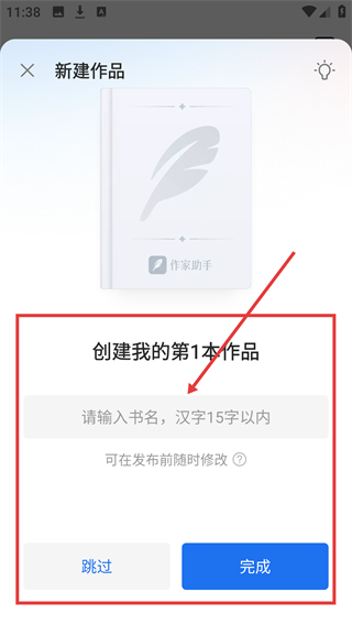 2、进入新建作品页后,输入书名(或选跳过),点击【完成】就能进入下一步设置哦。
