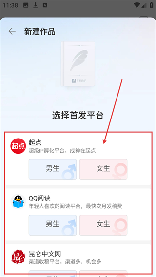 3、在选择首发平台页,挑选目标平台及分类(如起点-男生),就能确定作品发布方向啦。