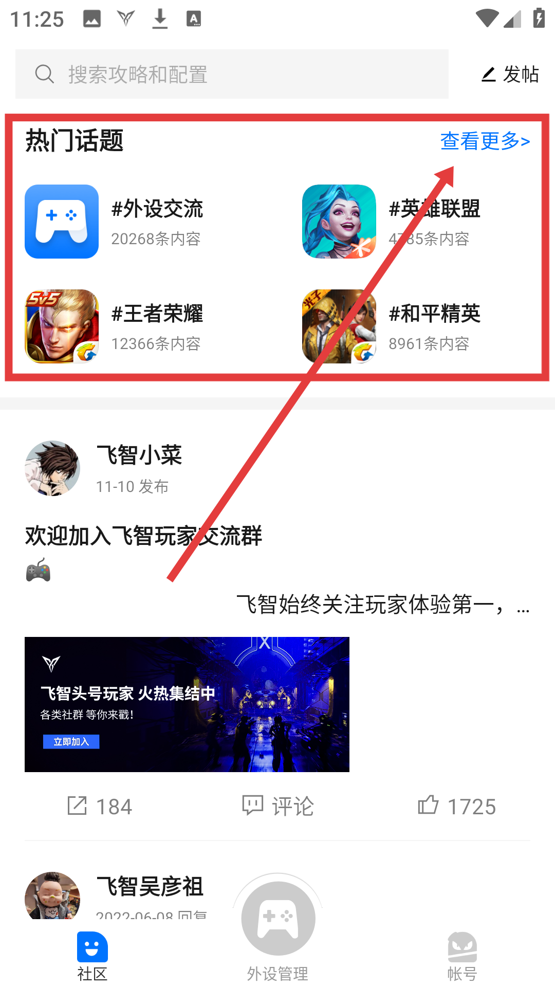 1、在社区页面,点【热门话题-查看更多】,可进入话题列表页浏览更多话题哦。