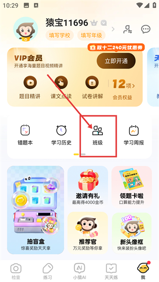 2、进入个人中心页后,点【班级】选项,就能进入班级功能页面,可选择加入班级哦。