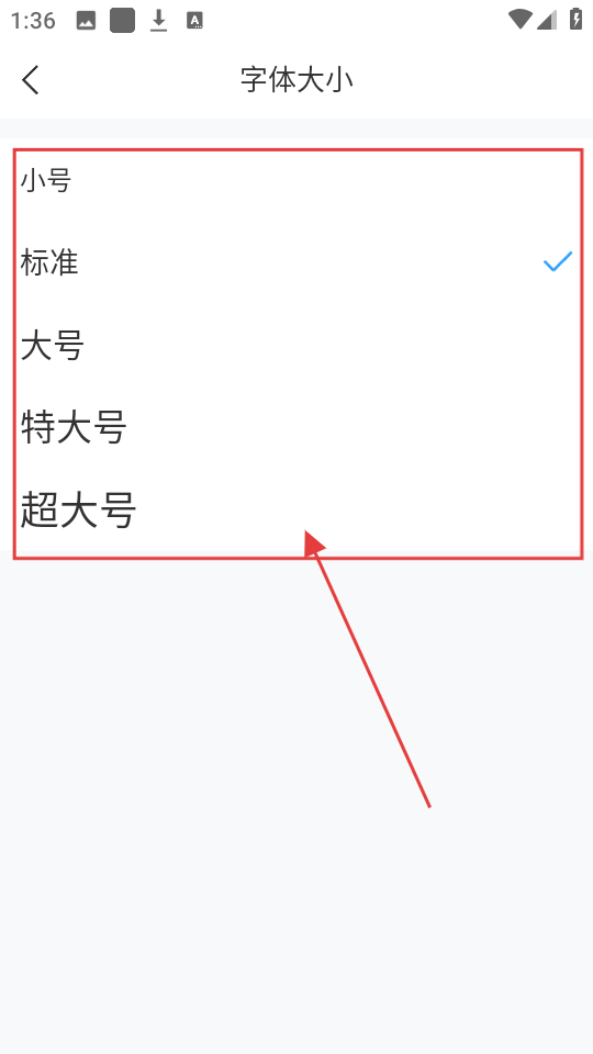 4、在字体大小设置页面,可选择小号、标准、大号等字体大小,调整软件的字体显示哦。