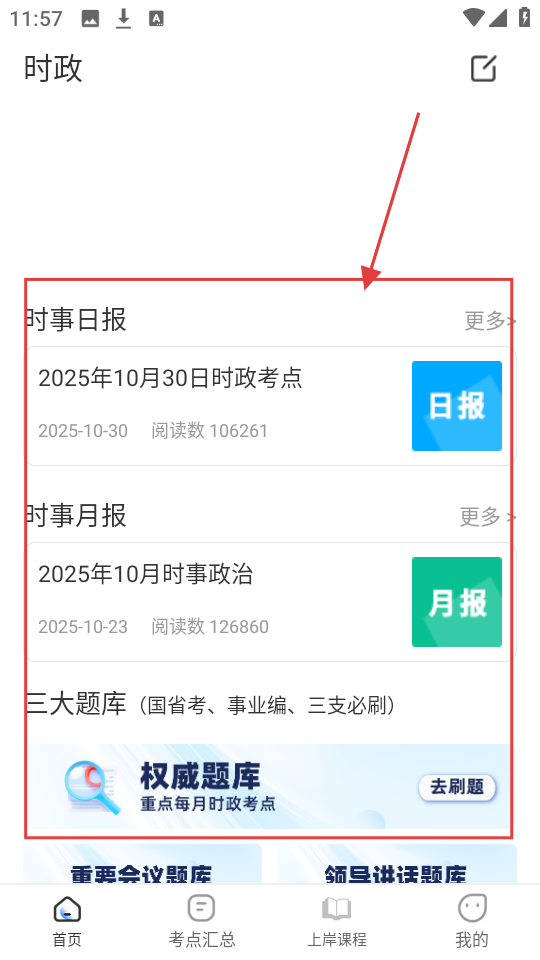 1、在时政页面查看时事日报、月报和题库,能了解时政考点,为考试做准备哦。