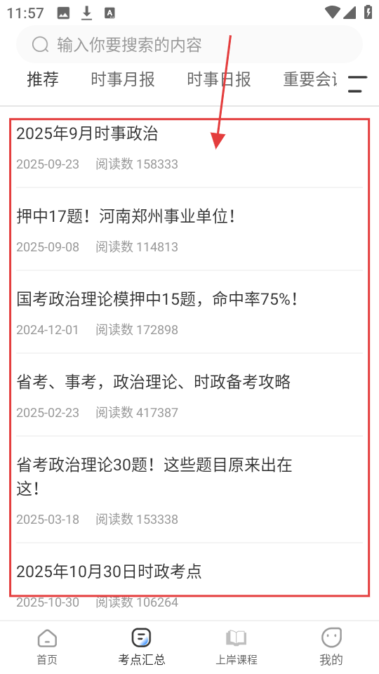 2、在考点汇总页面,能看到不同时间的时政内容,选择感兴趣的进行学习啦。