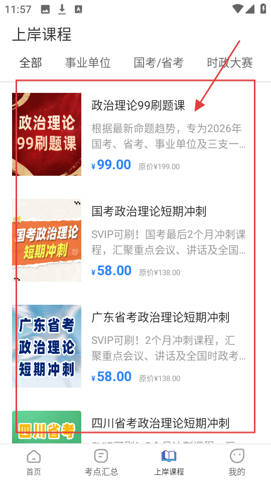 3、在上岸课程页面,有政治理论刷题课等课程,根据需求选择合适的课程哦。